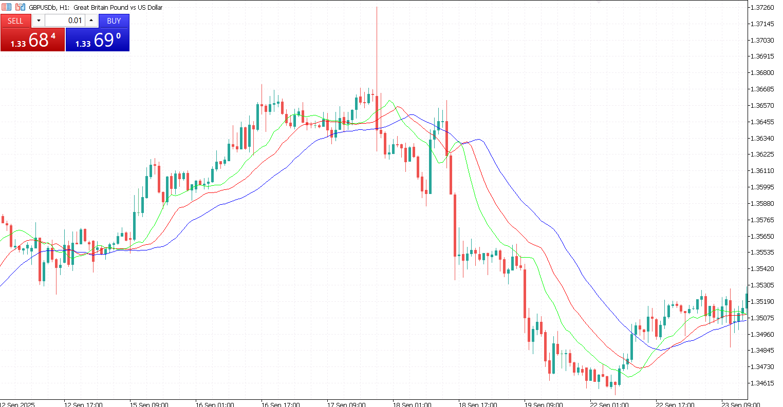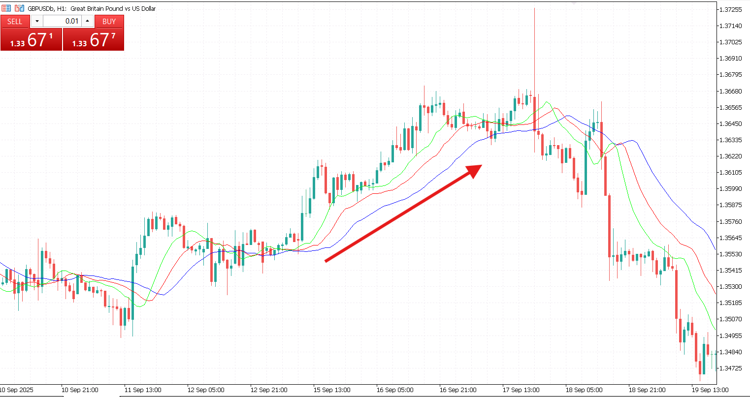- Lips (Green Line). A 5-period smoothed moving average shifted forward by 3 bars. This is the fastest-moving line and reacts quickly to price changes, signaling early trend shifts.