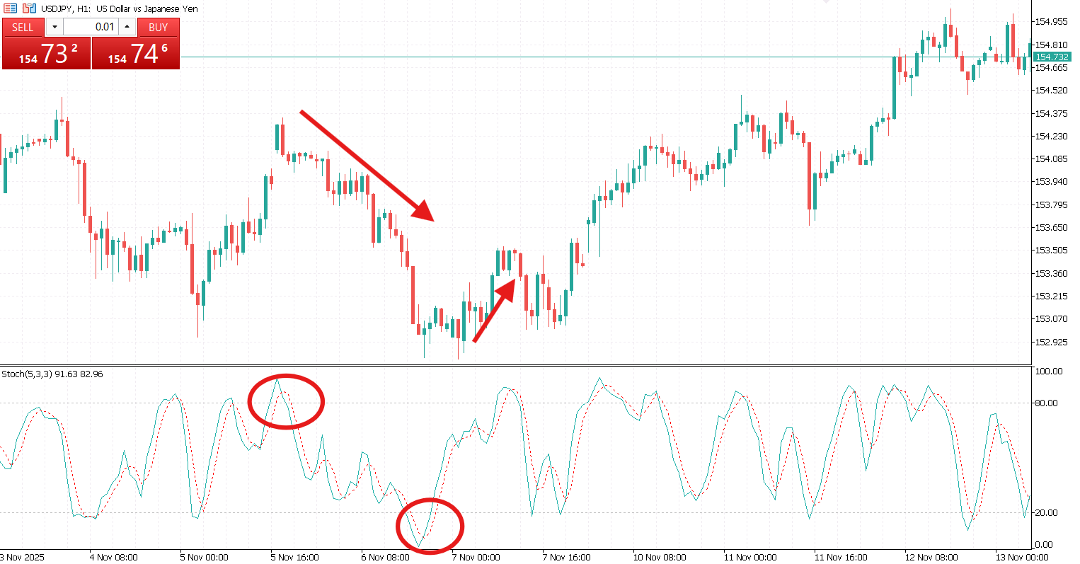 Stochastic divergence, similar to RSI divergence, can also be used. Bullish divergence occurs when the price forms a lower low while the stochastic forms a higher low, signaling weakening bearish momentum.