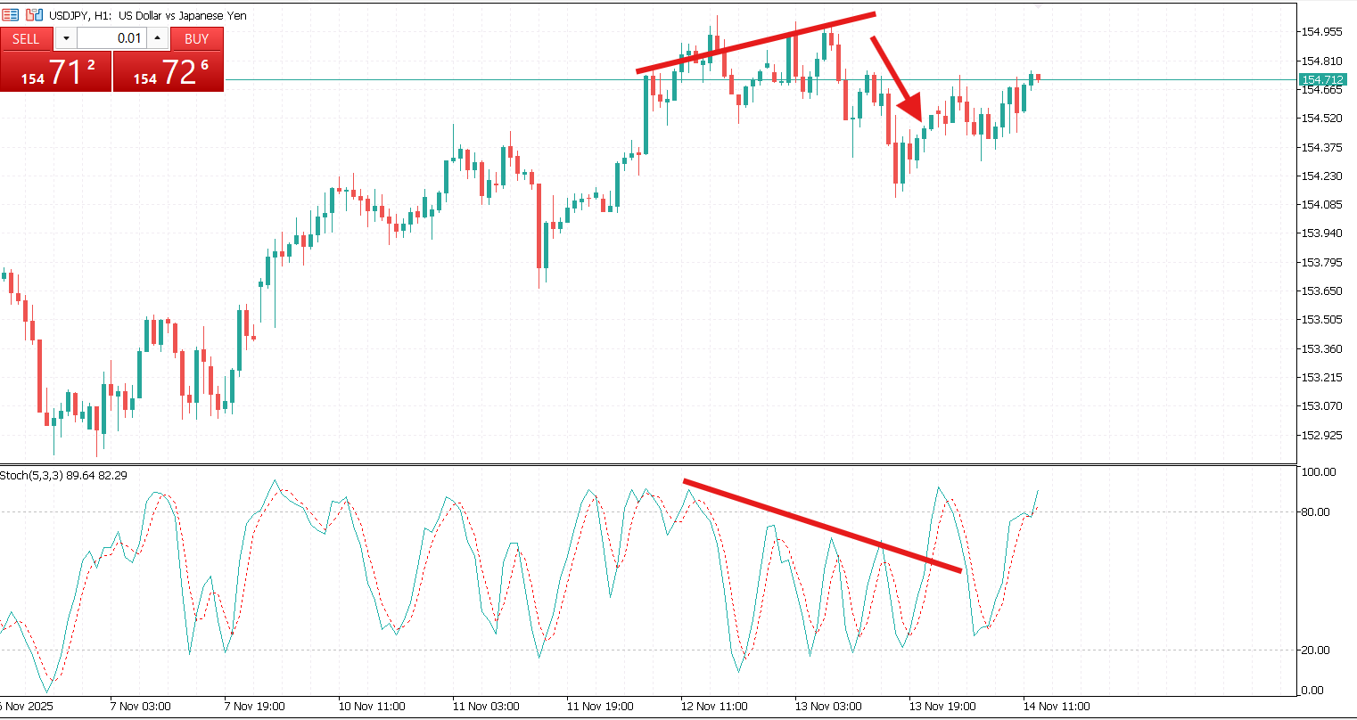 Bearish divergence occurs when the price forms a higher high while the stochastic forms a lower high, indicating weakening bullish momentum. Divergences can help anticipate reversals before they become obvious in price action.