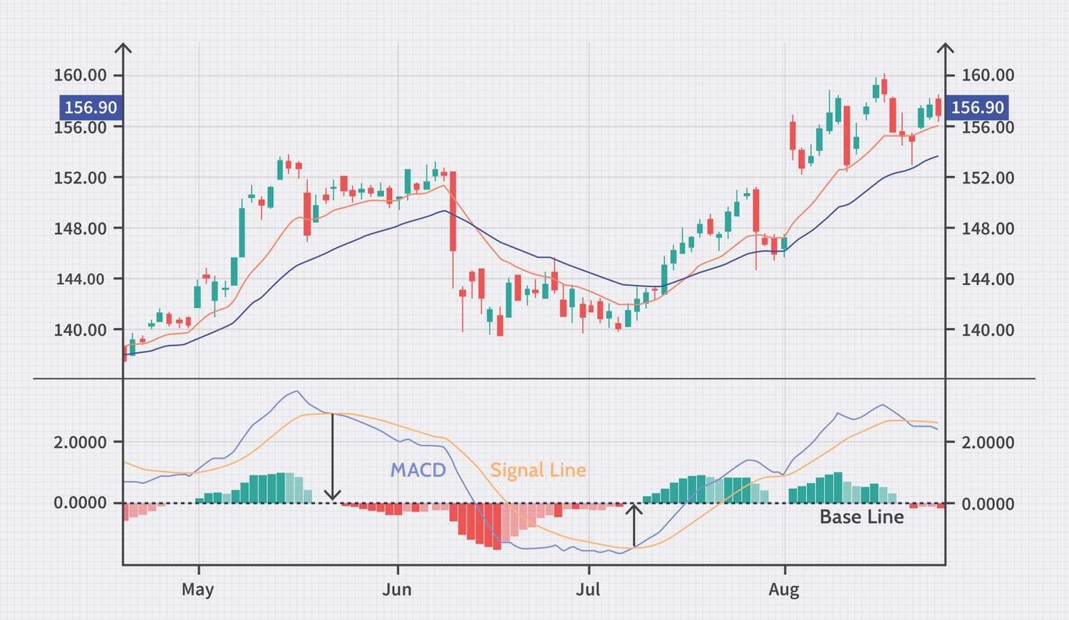 In addition to calculating the two moving averages, the MACD includes a third line called the signal line, typically a 9-day moving average. If the MACD line crosses above the signal line, one might anticipate the start of an upward trend; if it crosses below, a downward trend could be forthcoming.