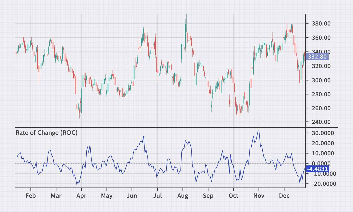 ROC is an oscillator that measures the rate of change in the price of an asset. It is calculated as the ratio of the current price of an asset to the price of the asset N periods ago. The ROC can be positive or negative, depending on whether the asset’s price has increased or decreased over the specified time period. ROC is typically used to identify turning points in price trends. If the ROC is above 0, it may indicate that the asset’s price is rising, and if the ROC is below 0, it suggests that the asset’s price is falling.